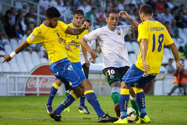 Островитяне из Лас Пальмаса приехали на стадион Эль Сардинеро одними из фаворитов гонки, показав на старте турнира отличную и красочную игру. Расинг Сантандер, не смотря на качественный футбол, никак не мог одержать своей первой победы, и в этот раз хотел показать своим зрителям, что они не зря поддерживают свою команду. Перекрыв практически все зоны, зелено-белые хозяева не давали возможности игрокам в желтой форме показать все, на что они способны. Нападающие Лас Пальмас пробовали заходить и с левого фланга и с правого, и с центральной зоны, но плотная игра оборонительной линии Расинга раз за разом разбивала все надежды бомбардиров островитян. А вот футболисты из Сантандера все-таки смогли найти уязвимое место у гостей (либо это была домашняя заготовка)! Один за другим, спортивные снаряды переводили на левый фланг, откуда следовали точные навесы и прострелы, которые, на опережении, 3 раза смогли замкнуть форварды хозяев. ![]()